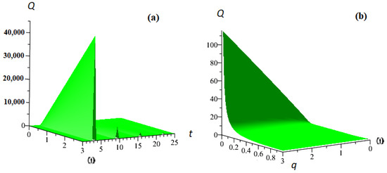 In Figure 14, the surfaces of AFC (Figure 14a) and PFC (Figure 14b) are given for the nonmonotonic function . In Figure 15, the Q-factor surface is given, taking into account the change in the exponent of the fractional derivative according to the law . Figure 15b shows the Q-factor surface when the parameter is an independent variable. According to Figure 15b, it can be seen that when the parameter q decreases, the quality factor increases. The maximum amplitude corresponds to the maximum Q-factor, and when the frequency decreases, the Q-factor decreases. However, most of the quality factors depend on the parameter q.