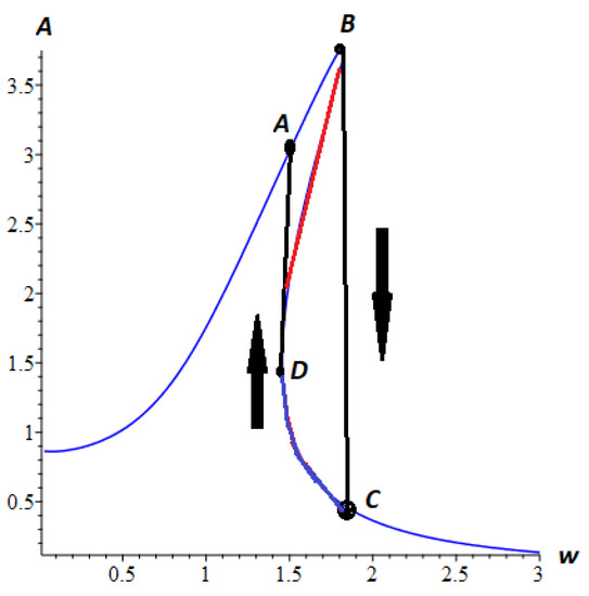 Figure 16 and Figure 18 clearly demonstrate the bistable behavior of a Duffing oscillator with a fractional derivative of variable order. When the frequency of the external force tends to the resonant (section AB), the amplitude of the oscillations begins to increase. Reaching the threshold value (point B), the oscillations enter an unstable mode (section BD), as a result of which the amplitude of the oscillations jumps from one stable mode to another (section BC), and then the amplitude decreases. When the frequency decreases, the amplitude increases first (CD section), then when the frequency reaches a lower resonant (point C) , there is a jump from one mode to another (AD section). Then the amplitude decreases. The ABCD polygon is called a hysteresis loop.