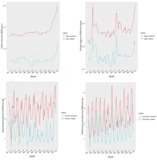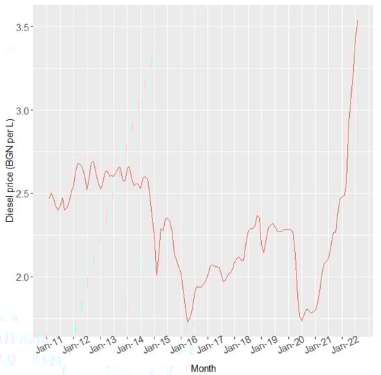 Ivanova, M.; Dospatliev, L. Effects of Diesel Price on Changes in Agricultural Commodity Prices in Bulgaria. Mathematics 2023, 11, 559. https://doi.org/10.3390/math11030559