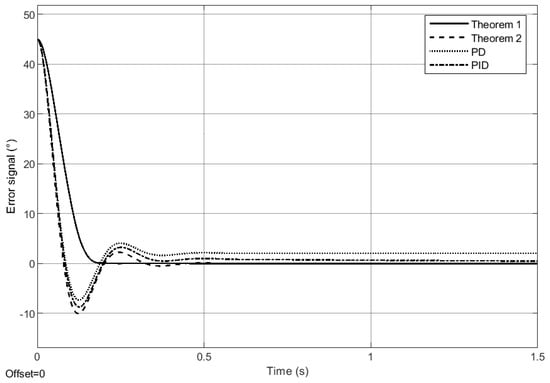 The simulations were conducted using the Euler integration method, with a step size of 0.001 s. The initial conditions were selected as and the desired value as . Thus, the behavior of the error, with diverse controllers, can be seen in Figure 2.