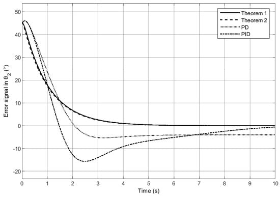 In the same way as the previous example, to simulate the results of the example, it is necessary to implement the parameters in Table 3. However, in this example, the robot has two DoFs. Therefore, the system has two laws of control, where the constant values and equations are chosen as Table 4 (the gains were calculated using [40]). The simulations were performed using Euler’s integration method, with a step size of 0.01 s. The initial conditions were selected as and the desired values as . Hence, Figure 4 and Figure 5 illustrate the results.