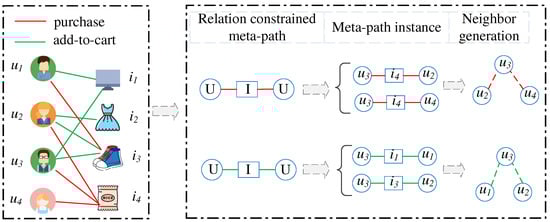 As shown in Figure 1, there are two relation-constrained metapaths: : and : , which correspond to different user behaviors. The instantiation process of the relation-constrained metapath is carried out by Equation (6). We have