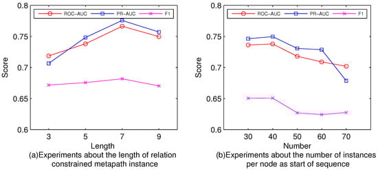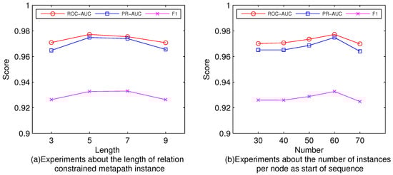 In order to verify the influence of the number of instances per node as the start of sequence, the length of relation constrained metapath instance is set to 5, and the experiments are carried out by changing the number of instances. As shown in Figure 3b, the values of metrics first increase, and then decrease. All the values of metrics reach the optimal value when the number of instances per node as the start of sequence is 60.