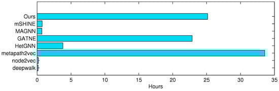 The time complexity in Algorithm 1 is determined by the number of nodes (), the number of edge types (), the vector dimension of node (d), and the length of metapath (l) and random walk (), the number of negative samples per training sample (L), which is expressed as . The space complexity is represented as by the number of nodes, the vector dimension of node, and the number of edge types.