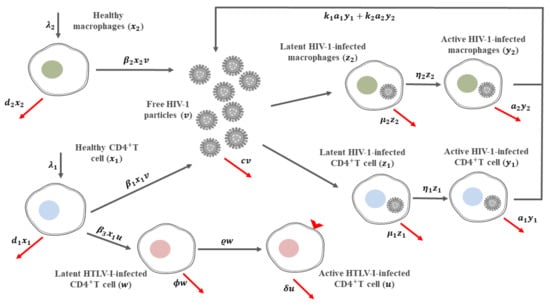 where , , , , , , v, w, and u are the concentrations of the susceptible CD4 T cells, latent HIV-1-infected CD4 T cells, active HIV-1-infected CD4 T cells, susceptible macrophages, latent HIV-1-infected macrophages, active HIV-1-infected macrophages, free HIV-1 particles, latent HTLV-I-infected CD4 T cells, and active HTLV-I-infected CD4 T cells, respectively. We note that the CD4T cells and macrophages are infected by HIV-1 through virus-to-cell transmission, and they are represented, respectively, by the terms and . The CD4T cells are infected by HTLV-I via cell-to-cell transmission through virological synapses, and this is represented by the term . A schematic representation of the model in (5)–(13) is illustrated in Figure 1.