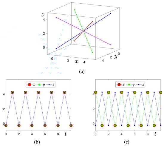 Next, we illustrate the coexistence of different dynamical regimes in the system (1) for various values of . Note that the system (1) is monostable on the line and multistable in . In particular, for the system (1) exhibits the coexistence of four 2-cycles shown in Figure 2a by color dots. For ease of visualization, the dots are connected by color lines. The cycle in red exhibits complete synchronization () (see time series in Figure 2b), while other three cycles exhibit partial synchronization. Namely, the green line in Figure 2a represents a cycle in which x-neuron and y-neuron are identical while z-neuron is in antiphase (see time series in Figure 2c). Here, the antiphase dynamics are manifested in the fact that both x and y values alternate with the z value, i.e., when x and y neurons fire, z-neuron is at rest state and vice versa. The other coexisting states are shown by the blue and pink lines. They indicate, respectively, a cycle in which x-neuron and z-neuron are identical while y-neuron is in antiphase, and a cycle in which y-neuron and z-neuron are identical while x-neuron is in antiphase.