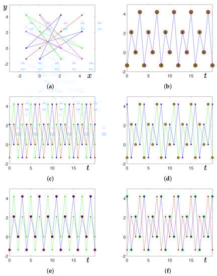 Coexisting 4-cycles in system (1) for . (a) Projections of 16 coexisting 4-cycles on the () plane. Time series of (b) complete synchronization ([0003]-pattern) and mixed synchronization with (c) [0111]-pattern, (d) [1002]-pattern, (e) [0102]-pattern, and (f) [2001]-pattern.