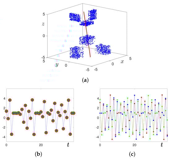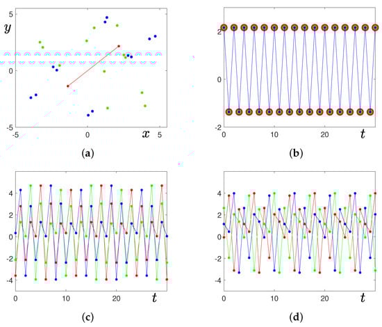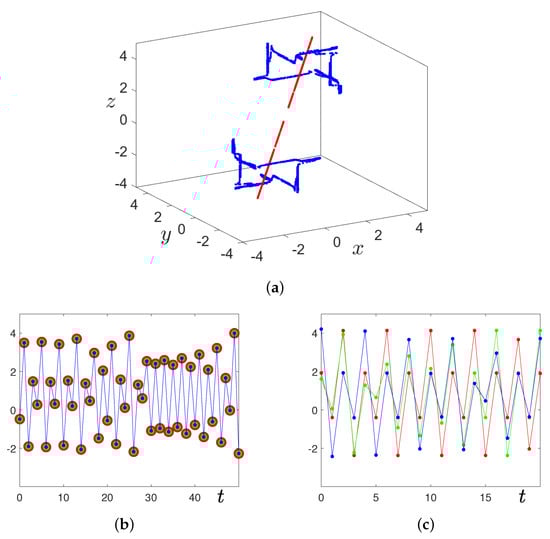 For , the coupled neurons are in the periodic window (see Figure 1b), where the system (1) has several coexisting stable solutions illustrated in Figure 5. Specifically, in Figure 5a we show 2-cycle (red line) and two 12-cycles (blue and green dots). The time series of these attractors are presented in Figure 5b–d, respectively. As seen from Figure 5b, the 2-cycle demonstrates complete synchronization with the [30]-pattern. At the same time, the blue 12-cycle exhibits phase synchronization with the [010101010101]-pattern (Figure 5c), while the green 12-cycle represents an asynchronous mode with the [011001100110]-pattern (Figure 5d).