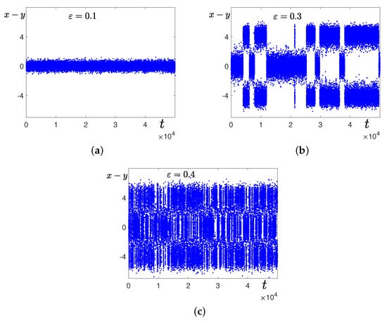Stochastic system (2) with = 0.2. Time series of difference for (a) (noisy synchronous state), (b) (low-frequency intermittency), and (c) (high-frequency intermittency).