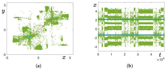Stochastic system (2) with = 0.8. (a) Phase states and (b) time series for (light blue zones) and (green zones). The deterministic in-phase 2-cycle is shown in red.