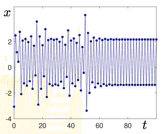 In Figure 8, we see areas where the random states are highly concentrated and areas with a blurred distribution. The concentrated areas correspond to the location of points of the deterministic cycles while the blurred areas appear in zones of chaotic transients. The example of such chaotic transient in the deterministic system (1) is illustrated in Figure 9 by x-time series. As can be seen, the system behaves chaotically before approaching the deterministic 2-cycle.