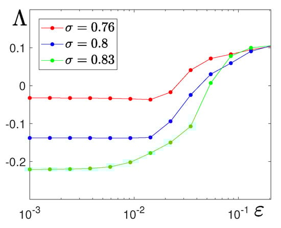 Note that such stochastic transformations in the dynamics are accompanied by transitions from order to chaos. These transitions occur for a certain noise level, as seen from Figure 10, where we plot the largest Lyapunov exponents versus the noise amplitude for random solutions starting at the points of the completely synchronized 2-cycle. Negative values of localize -zones of order. As exceeds some threshold, the Lyapunov exponents become positive, so that the system dynamics becomes chaotic.