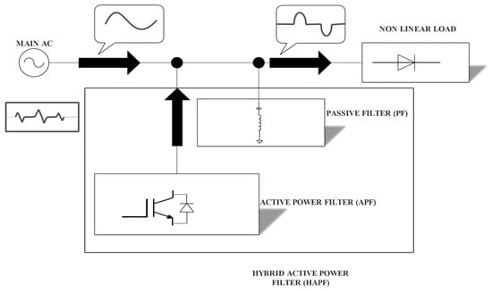 To cover up the shortcoming of active and passive filters, HAPF was developed to mitigate both the voltage and current harmonics. A hybrid power filter’s structure is available in both series and parallel. HAPF combines the benefits of APF and PPF. The two most popular topologies of HAPF have been deeply studied in the literature [,,]. Figure 1 shows the basic configuration of HAPF, consisting of a PF, APF, AC source, and a non-linear load.