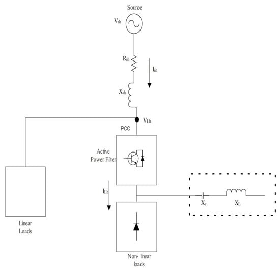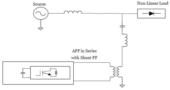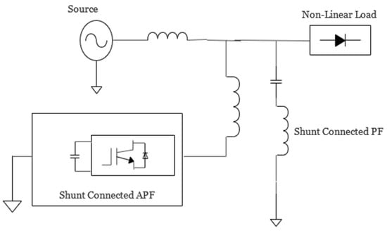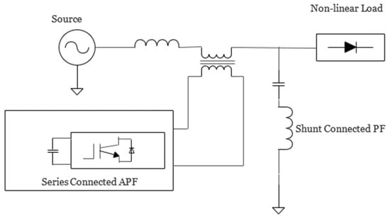 The filter configuration of APF in series with shunt PF is shown in Figure 4. Active power filters provide the necessary DC link voltage for harmonic correction. The stress on the power electronic switches found in the APF is decreased by the passive filter, which maintains the voltage of the grid’s basic component. High to medium voltage ranges employ this design.