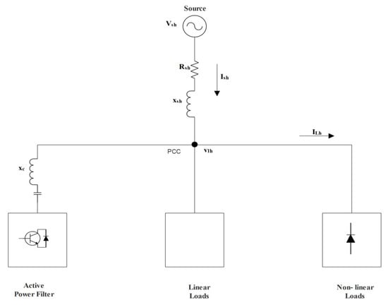 Utility supply voltage and nonlinear load are expressed by the Thevenin voltage source and harmonic current source, respectively, presented as:
