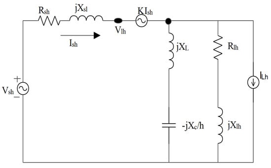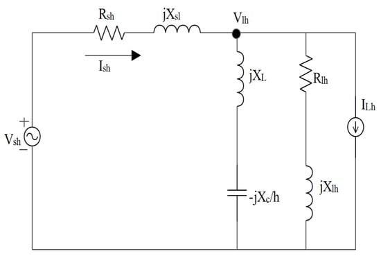 At higher level harmonic, i.e., ‘h ≥ 2’, after analyzing the equivalent circuit of Figure 5 for the series realization of the filter topology, the following relationship is identified between voltage and current of load and supply end, respectively: