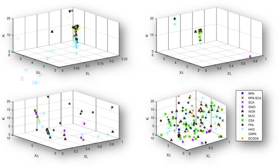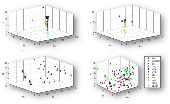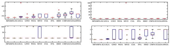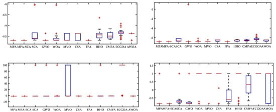 Figure 10 and Figure 11 exhibit the data distribution characteristics of the optimization process. It appears that the optimization process is more accurate when it is solved with proposed MPA-SCA. From this result, it is concluded that the narrow characteristic of the boxplot reveals an exciting virtue of the proposed algorithm for solving such types of problems.