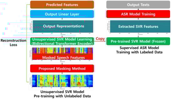 During SVR learning, only unlabeled speech data are used. Our SVR model architecture for pretraining is composed of several bidirectional Transformer encoders [33,37] that extract latent speech vector representations from a log mel filterbank. The left part of Figure 1 illustrates the unsupervised SVR model pretraining. The proposed network is a stack of bidirectional Transformer layers, where each layer has an identical configuration to those from the reconstruction objective functions. Our SVR model can directly extract high-level contextualized speech representations.