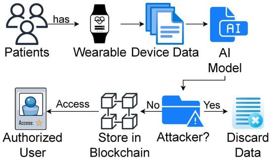 The proposed system model is represented in Figure 1. Every patient has a wearable gadget that actively monitors the patient’s health data. The primary goal of the proposed system is to securely store health data such that there is no data breach by an unauthorized user. To do this, the wearable device’s integrity is first evaluated. If the wearable gadget is attacked, the data it transmits are not recorded on the blockchain and is therefore deleted. Once the device’s integrity has been certified, the patient’s data are transmitted to the blockchain for storage. The blockchain’s smart contract allows just the most critical data to be stored on the network. It is also in charge of data access control. Only those participating in the patient’s therapy have access to the data. The forthcoming section provides a detailed description of the system model.