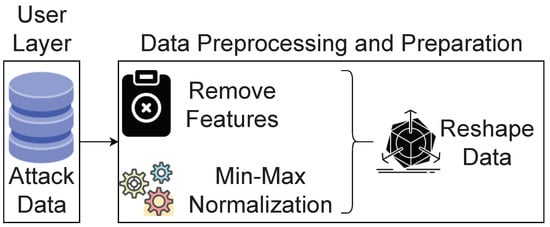 The collected dataset requires preprocessing before it is forwarded to training and prediction. Figure 3 depicts the data preprocessing and preparation stages in detail. Only 26 of the 44 qualities truly contribute to forecasting the result. Flags, IP addresses, MAC addresses, and other trivial information are removed from the dataset as they are not competent features compared to the others. After obtaining the relevant features, their values are normalized using the min-max scaler from the sklearn package. Because the values of characteristics have varying ranges, normalization is required. Normalizing the data puts the mean closer to 0 and speeds up convergence. The values are normalized to be between 0 and 1, inclusive. The min-max scaler formula is as follows: