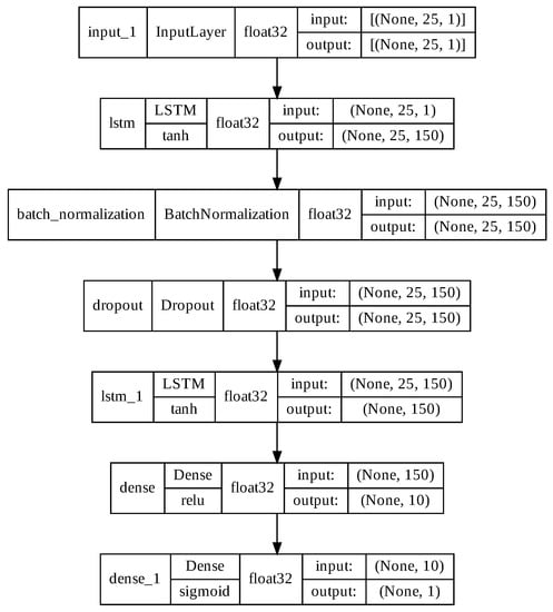 where is the candidate cell at timestamp t. Figure 4 shows the overall architecture of the LSTM model which is used for training and prediction. Algorithm 2 represents the prediction flow of the LSTM-based sequence model. Since LSTM is a type of recurrent neural network, the computational complexity of these models is dependent on the length of the input sequence. This indicates that, if the length of the input sequence is l, then the computational complexity of LSTM will be . The complexity is because, in order to obtain the output, the LSTM model must traverse the entire sequence of input.