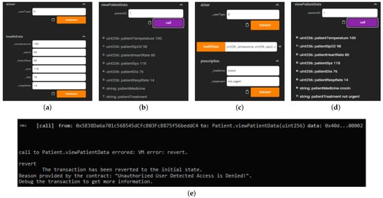 Smart contract for storing user’s health data. (a) Smart contract for a patient entering details. (b) Smart contract for patient viewing details. (c) Smart contract for a doctor entering details. (d) Smart contract for a doctor viewing details. (e) Warning message when an unauthorized user tries to access patient record.