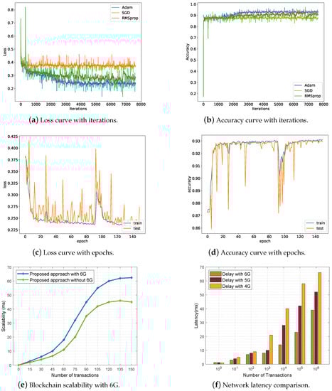 Loss and accuracy curves for different model optimizers during the training process. Scalability and Latency graphs to show the influence of a 6G communication.