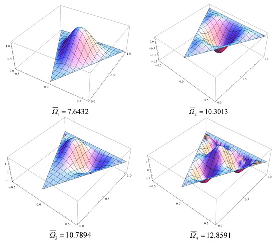 Results in Table 1 show that increasing N leads to better fulfilling of the boundary conditions of Equation (44). Furthermore, the first eight terms in the representation of the solution in Equation (16) allow us to fulfill the boundary conditions with a discrepancy of less than 1%. The greatest discrepancy of the constructed solution is observed at the corner point of the plate, which was observed by other investigators [7,8,9] as well, who used a polygonal-based approach to solve triangular plate vibration problems.