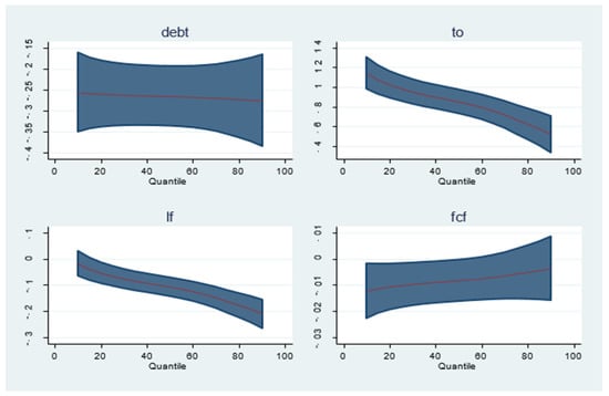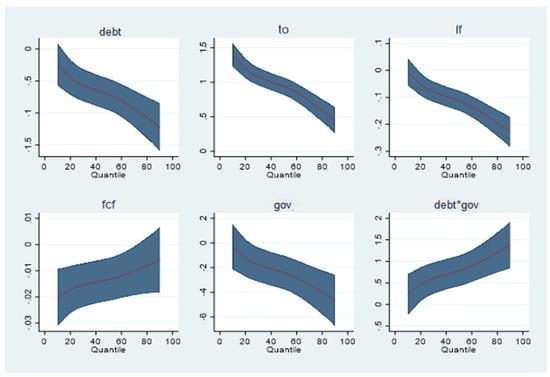 Table 3 depicts the impacts of public debt on economic growth for the selected developing countries under different economic circumstances. The estimations take the form . The coefficients of public debt were negative and significant at a 1% significance level under all quantiles, indicating that public debt impedes economic growth in different economic conditions for developing countries. As a result, an increase in public debt is detrimental to the economic activities of the sample countries. Some studies found that developing countries mostly failed to trigger macroeconomic performance using public debt due to fiscal mismanagement, weak policymaking, high debt service charges, high policy implementation charges, and so on [57]. Similarly, Temsumrit [58] argued that the level of democracy and institutional quality were two major factors that supported the proper use of public debt and promoted economic growth, while most developing countries faced difficulties in maintaining stable democratic governments and strong institutional quality. The poor governance issue might be the cause of poor economic growth in the concerned developing countries, which were also examined in this study. However, Figure 1 also confirms that public debt is negatively associated with economic growth in developing countries.