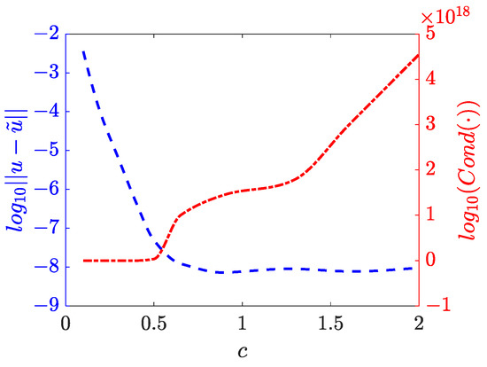 Variation of accuracy and condition number of the stiffness matrix with shape parameter c when .