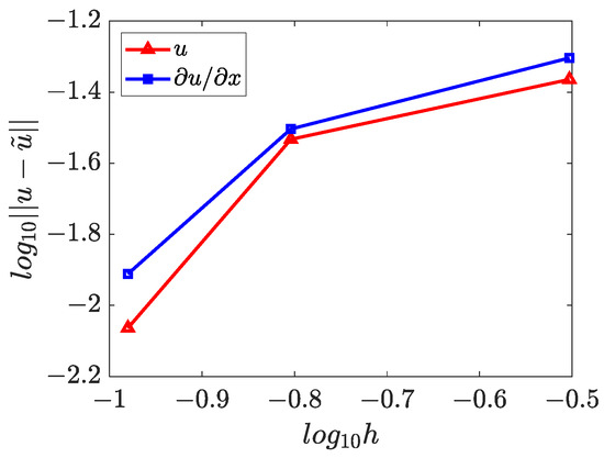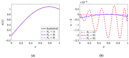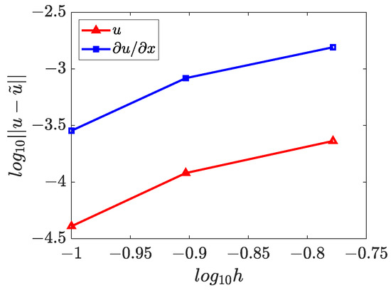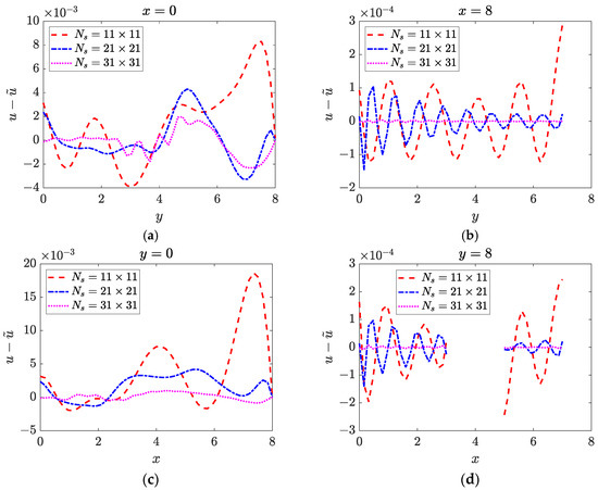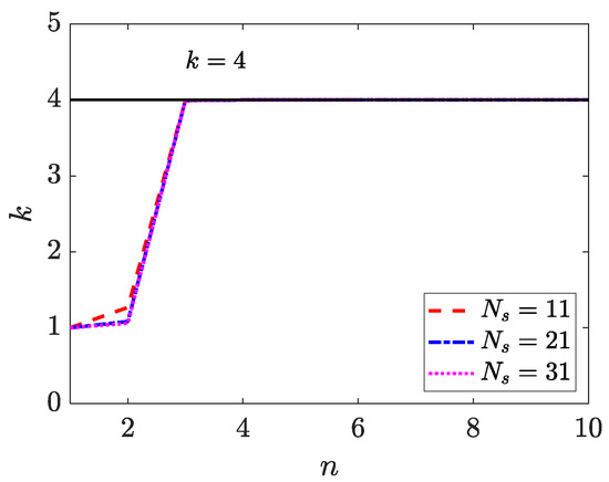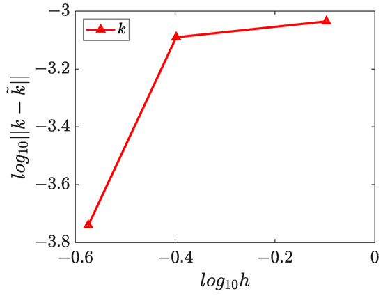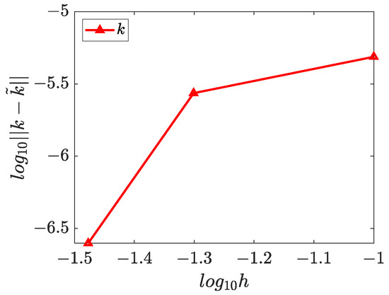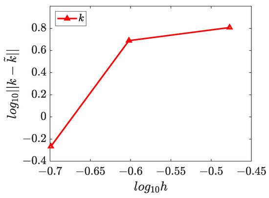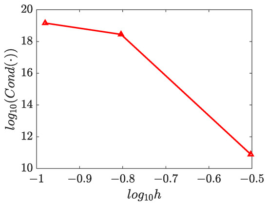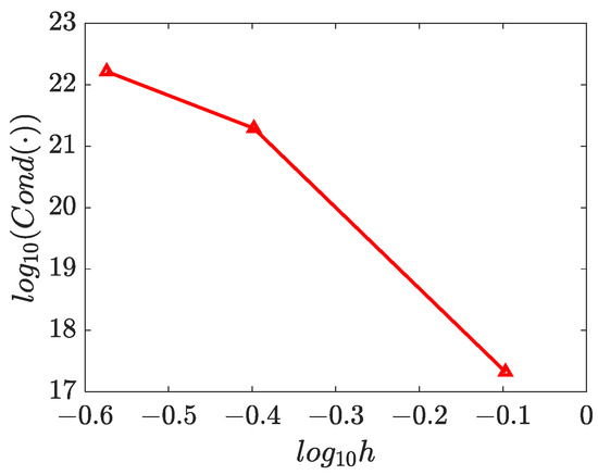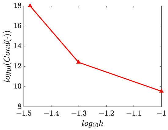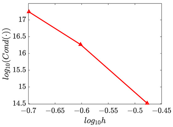The numerical solutions for and are presented in Figure 15, Figure 16 and Figure 17, which demonstrate that the WRBCM can also achieve a high accuracy for solving the inverse Helmholtz problem of the varying parameter identification. The convergence studies for and are exhibited in Figure 18 and Figure 19, respectively. These indicate that for the varying parameter identification problem, the WRBCM can also acquire the exponential convergence for both the solutions and the identified parameter. The condition number of the stiffness matrix is shown in Figure 20, and a similar conclusion can be achieved, as in example 1 and 2.