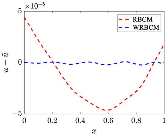 Solution comparison between RBCM and WRBCM for the 1D constant parameter identification problem.