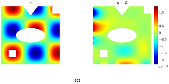 Solution and corresponding error for the 2D constant parameter identification problem in irregular geometry under different discretizations: (a) ; (b) ; (c) .