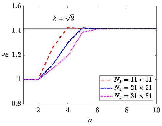 Figure 1 presents the influence of shape parameter on accuracy and stability when . The blue dotted line represents the L2 norm of u, and the red dot dash line represents the condition number of the stiffness matrix. It can be observed that with the increase in the shape parameter, the accuracy increases obviously at the beginning and gradually reaches the peak. However, the condition number of the stiffness matrix is always increasing with the growth of the shape parameter, which means that the stability is decreasing. Therefore, the criterion for selecting the optimal shape parameter is to increase the accuracy as much as possible until the condition number of the stiffness matrix dramatically affects the solution. The optimal shape parameter can be selected at the intersection of the two lines displayed in Figure 1. The value of shape parameter c is chosen to be 1.1, 0.8 and 0.65, which corresponds to , 21 and 31, respectively. Figure 2 and Figure 3 present the solution and the corresponding error as well as the convergence of WRBCM in the 1D parameter identification inverse Helmholtz problem under different discretizations, which demonstrate the good accuracy and exponential convergence of the proposed method. The weights imposed on the Dirichlet boundary and measurement conditions are which agree well with the mathematical derivation presented in Equation (47). Figure 4 shows that the corresponding error of WRBCM after adding weights on the boundary is much lower than RBCM. The iteration processes of wave number are shown in Figure 5, in which the error bound is set to be 10−10. The results demonstrate that the iteration solutions converge quite fast. The convergence of the wave number is displayed in Figure 6, which indicates that the solutions of the identified parameter can also achieve exponential convergence. Convergence studies presented in Figure 3 and Figure 6 demonstrate that the proposed WRBCM can acquire optimal convergences for both the unknown and parameter solutions in the 1D inverse Helmholtz problem. Since WRBCM is a global method, it can be observed from Figure 7 that the condition number of the stiffness matrix will increase with the refinement of the discrete points.