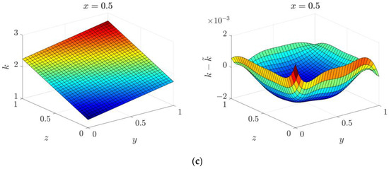 Solution and corresponding error for the 3D parameter identification problem in cubic domain under different discretizations: (a) ; (b) ; (c) .