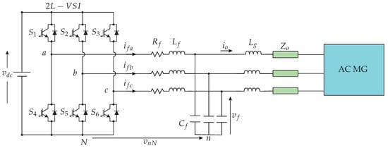 Diagram of a two-level three-phase VSI with filter, coupled to an AC microgrid via distribution line with an impedance .