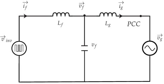 In Figure 2 the typical configuration of the two-level three-phase equipped with the filter can be seen. Through this filter, the power from the DG flows to the rest of the islanded AC microgrid. The used filter for each phase has its components defined as , , and , that are filter inductance, filter capacitance, and grid inductance, respectively. For sake of simplicity and further explanation, in Figure 3, the equivalent circuit in the stationary reference frame of the filter is shown. Then, the complex state variables are as follows: