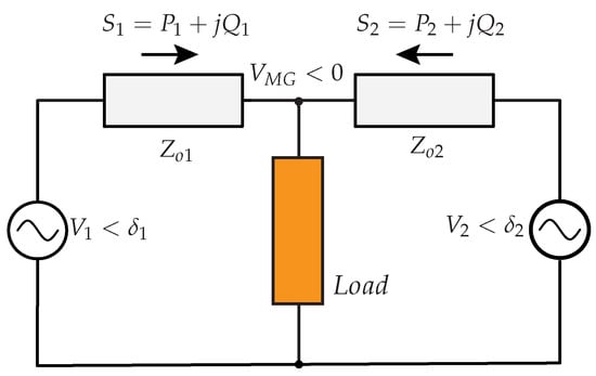 The diagram depicted in Figure 6 represents two VSIs sharing a common load connected to an AC microgrid bus through distribution lines with complex impedances, . For establishing the control strategy of these connected power converters, active and reactive power are exchanged through the distribution lines of the AC microgrid. Then, considering hierarchical control in microgrids, this power exchange can be regulated by power sharing control which can be classified as primary control [3,33,40].