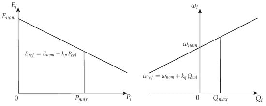 Subsequently, for establishing the outer droop control, and considering Equations (23) and (24), the droop control is designed using the following equations [1,33]: