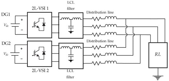 To corroborate the concept of the proposed control scheme, simulations in MATLAB/Simulink are carried out. The studied microgrid system consists of an isolated AC microgrid of two parallel -filtered VSIs, sharing an load, as shown in Figure 9. The parameters of the simulations are listed in Table 2. Nominal parameters and power ratings of the two DGs are chosen to be the same. Droop control with resistive virtual impedance external-loop is utilised to produce the voltage reference to feed the predictive model of the filter to evaluate the multiobjective cost function from Equation (16).