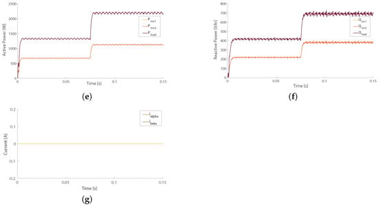 As mentioned in [1,33], and from Equations (27) and (28), respectively, must be damped via low-pass filters that normally have a smaller bandwidth order of magnitude than underlying loops in hierarchical linear control [3]. This may lead to a very slow transient reaction. By using MPC as the inner control scheme of each VSI in an AC microgrid, filtering is not necessary, since, in this case, the speed for the MPC technique is only restricted by the sampling time . Additionally, since the variations in and are softened by the droop coefficients, and , finally, the oscillations in and have an almost negligible effect on the calculation of and [1,33].