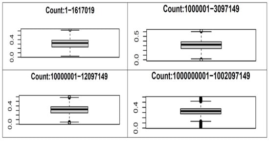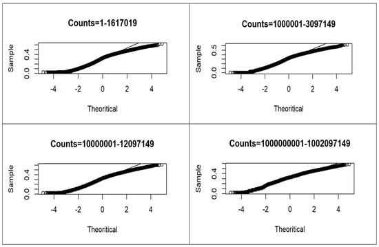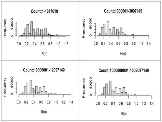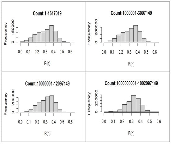As with the dataset of , to check the function’s probabilistic behavior then, we conducted a comparative analysis of the deterministic factor of the 4 datasets of Collatz orbits to 1 of the odd natural numbers up to 1002097149. Figure 6, Figure 7 and Figure 8 show the frequency distribution of of the chosen 4 groups, their Boxplots, and their q-q plot generated by using RStudio software.