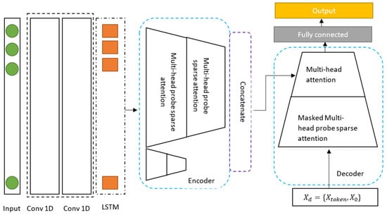 where is the start token and is the placeholder for the target sequence. In the Probsparse self-attention computing mechanism, the masked dot-products are set to , which implements masked multi-head attention. By preventing each position from anticipating the subsequent ones, auto-regressive behavior is avoided. To generate the output, a fully connected layer is used, with its size depending on the forecasting variate.