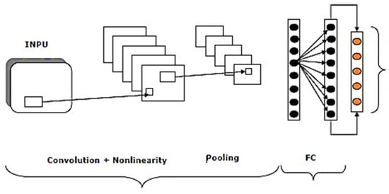 The maximum pooling layer is performed by selecting the maximum value in a given matrix. The fully connected layer can be dotted with a nonlinear activation function, such as a ReLU. The output layer for classification can be dotted with a softmax activation function, and for regression, it is dotted with a linear regression function. The softmax function can be computed using Equation (4), and the linear regression function can be computed using Equation (5):