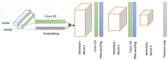 where maxpool represents the maximum pooling layer with a stride of 2; ELU is the exponential linear unit activation function; conv1D is a one-dimensional convolution layer with a kernel size of 3; and is the output of the proposed self-attention block. The proposed decoder structure is presented in Figure 6.