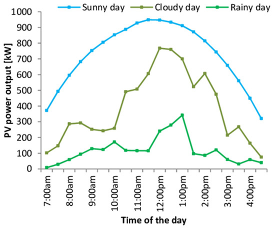The Fingrid open dataset [25] was used to obtain the training data. The gathered data were updated at an hourly rate. The data were collected from a solar power plant established in Finland, which provided historical time series and weather conditions. The solar power plant can produce one megawatt of power per hour in total. The data were downloaded in the CSV format. Using the min-max normalization approach, the training data were normalized between zero and one. Data normalization enables performance comparisons without taking into consideration the solar power facility’s capacity. By excluding power levels throughout the night and on overcast days, the data were then filtered. After splitting the data into three sets, 60% were utilized for training, 10% were utilized for validation, and 30% were utilized for testing. A simple example of solar power prediction in relation to weather conditions, such as sunny, cloudy, and rainy, is presented in Figure 7.