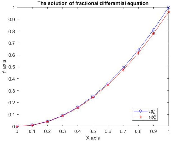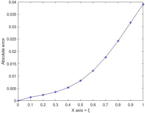 Figure 1 compares both the numerical and exact solutions for the fractional differential Equation (21). Moreover, Figure 2 shows the absolute error between the numerical and exact solutions.