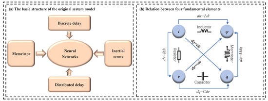 It is well known that conventional NNs are usually presented by first-order differential equations. In 1986, Westervelt and Babcock established the NNs with an inertial item by adding the inductors into the NNs’ model, which could be described by a second-order form [20]. Inertial neural networks (INNs) have evident engineering and biological backgrounds, and the dynamical properties of INNs are more complicated than conventional NNs [21,22,23,24]. Recently, some results on the dynamical behaviors of INNs, which include periodicity, stability, dissipativity and so on, have been presented [25,26,27,28,29]. With the application of INNs to various fields such as secure communication, signal processing and image encryption [30,31,32], some further studies of the INNs are essential and significant. Meanwhile, due to the inherent communication times between the neurons and the limited switching speed of amplifiers, the time delays unavoidably exist in the process of the implementation of INNs (see Figure 1a). However, it has been proved in many previous works that the existence of time delays may cause divergence, oscillation, and even instability of the system [33,34,35]. Hence, the dynamic analysis of INNs with mixed time-varying delays (MTVDs) is necessary for their successful applications.