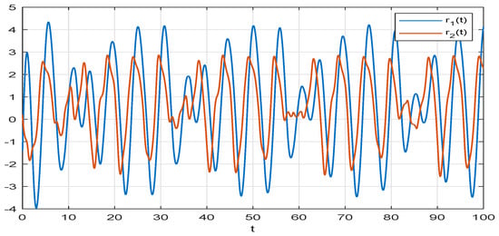 where the initial value of system (15) are and the controllers are defined in (7). The drive and response MINNs (14) and (15) and their synchronization error system without controller are given in Figure 2 and Figure 3, which imply that drive-response MINNs will not achieve synchronization as time increases.