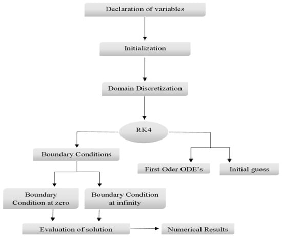The modeled equations are solved numerically by the RK4 scheme and the shooting technique. For this objective, the higher-order ODEs are converted to first order differential equations by introducing new variables. The set of equations along with the boundary constraint are solved with the help of RK4 and the shooting technique by taking step size and tolerance 10−5. This shows that our solution obtained by the RK4 built-in function in MATLAB is corrected and converges up to the five decimal places by ignoring the irregular heat source and chemical reaction, as reported by Tili et al. [55]. Table 1 provides the stability analysis of the current study with Tili et al. [55], and an outstanding agreement is found. The flow chart of the RK4 method is shown in Figure 2.